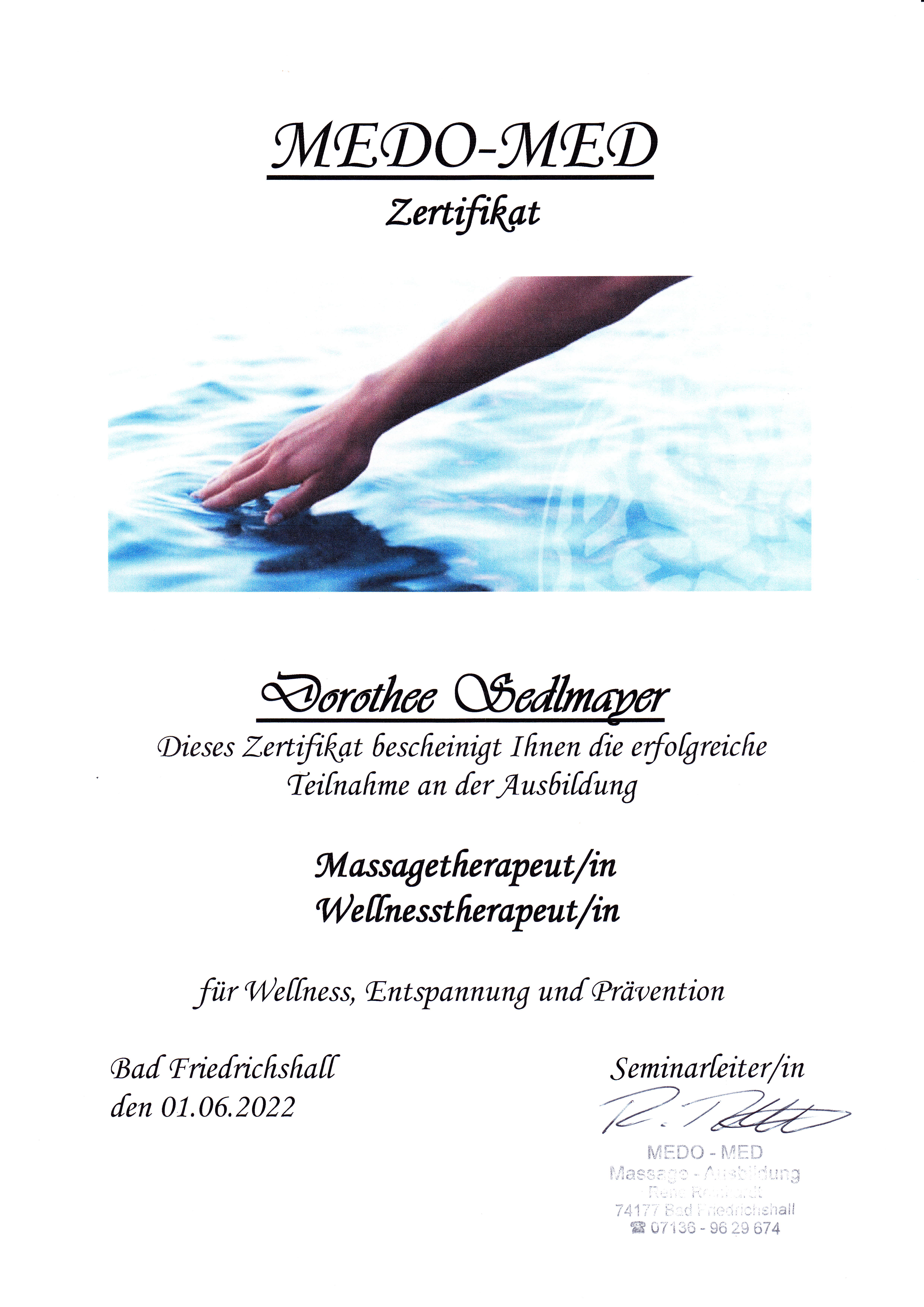 Da mir die Ausbildung zur Physiotherapeutin im ersten Anlauf leider verwehrt blieb, erlernte ich als „medizinischen Grundberuf“ Krankenschwester und besuchte parallel dazu die Kurse zur Massagetherapeutin für Akupunkt-Massage nach Penzel (kurz: APM).