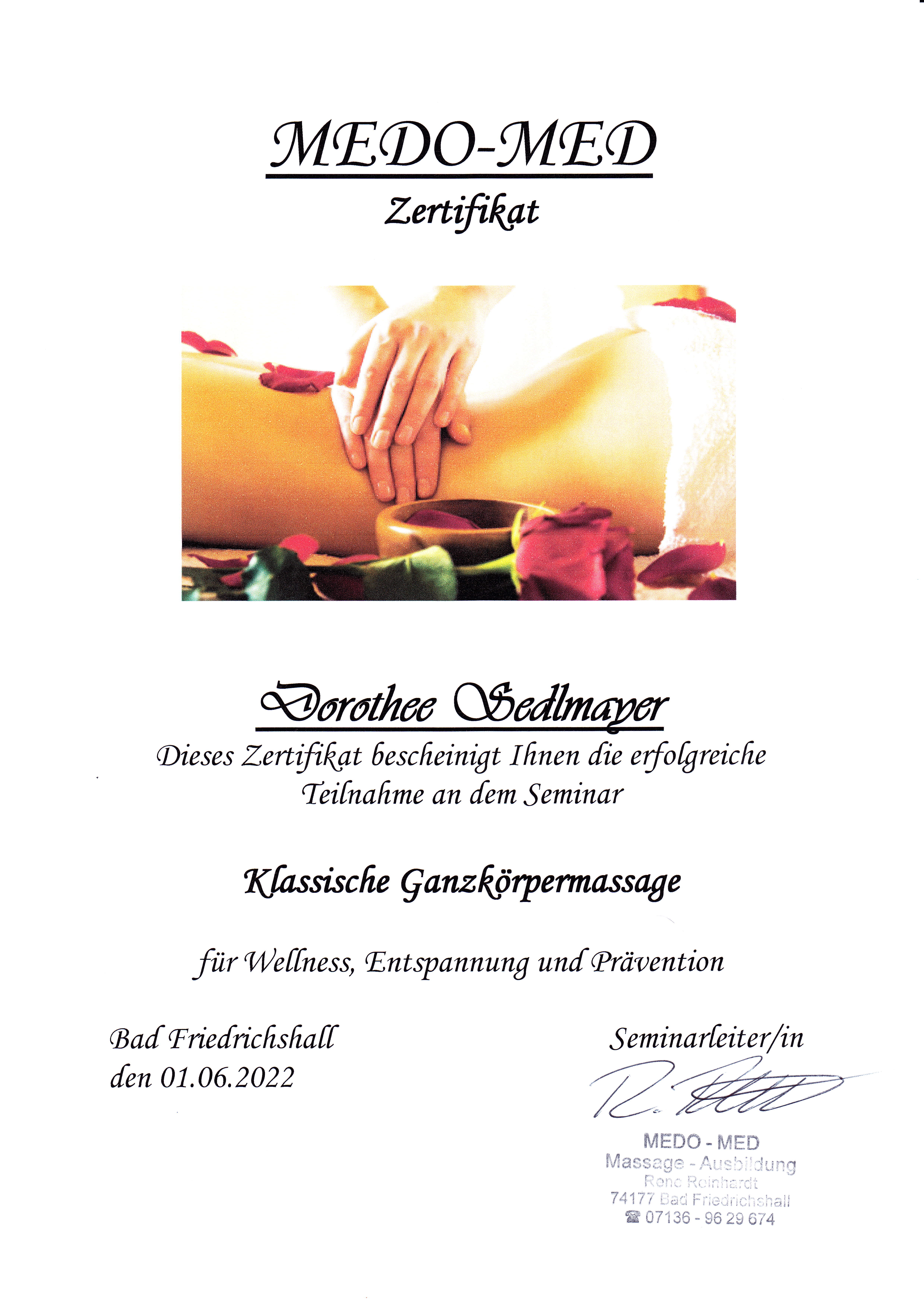 Da mir die Ausbildung zur Physiotherapeutin im ersten Anlauf leider verwehrt blieb, erlernte ich als „medizinischen Grundberuf“ Krankenschwester und besuchte parallel dazu die Kurse zur Massagetherapeutin für Akupunkt-Massage nach Penzel (kurz: APM).
