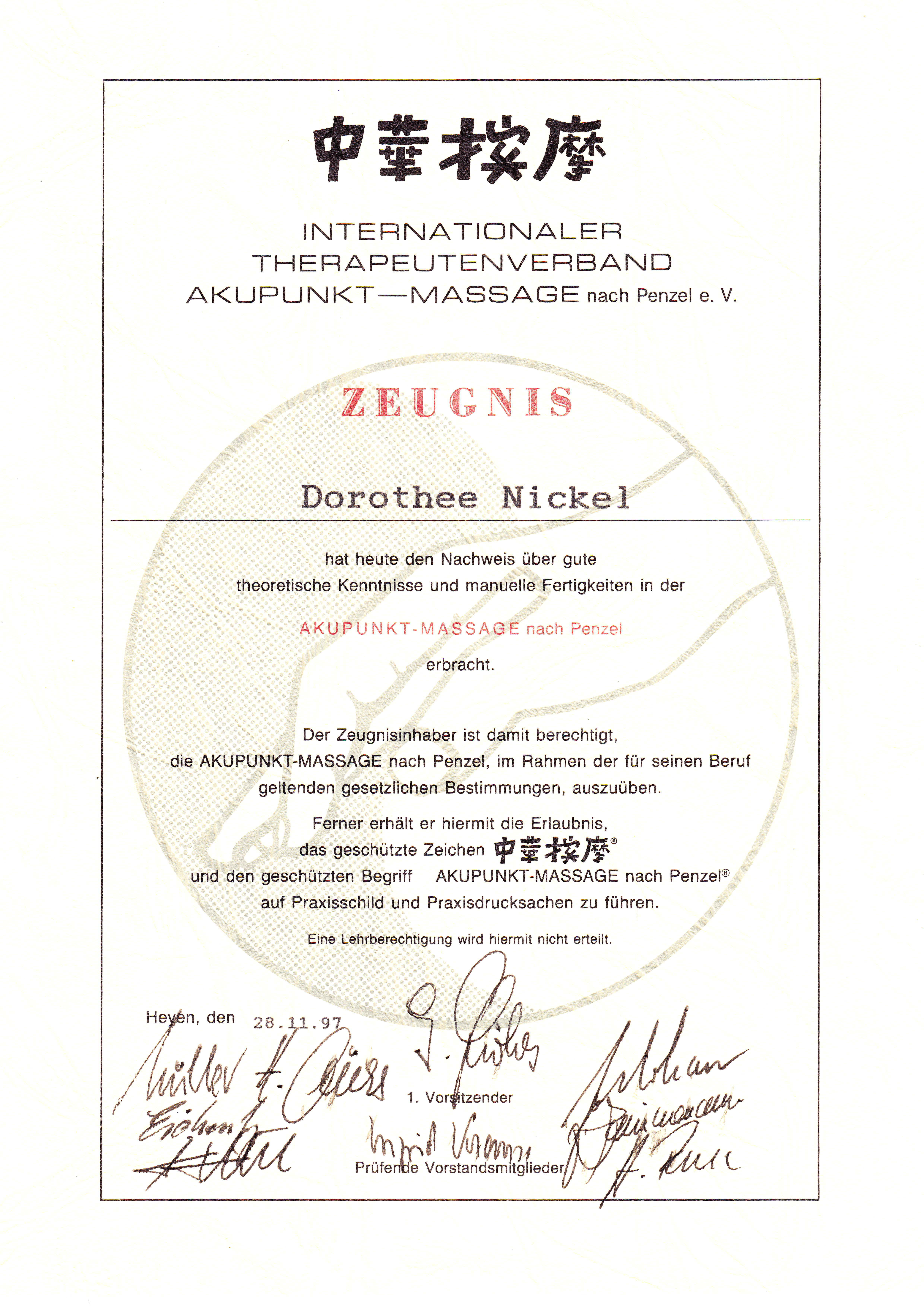 Noch während meiner Schulzeit lernte ich durch meine Mutter, die selber damit behandelt wurde, die Akupunkt-Massage nach Penzel kennen.